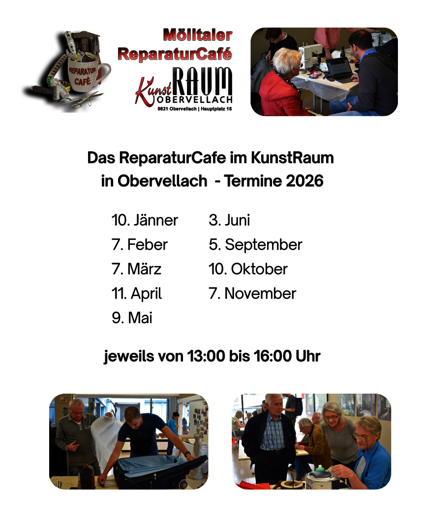 Termine 2026 für das Mölltaler ReparaturCafe im KunstRaum Obervellach